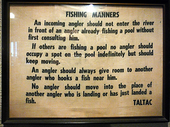 The reports and experience of poor fishing in the last few years has meant that there have been fewer anglers this year judging by license sales and competition for fishing spots. Even with fewer anglers I still see examples of poor manners on the river. This may be due to ignorance of angling etiquette that has existed for a long period of time. Some years ago TALTAC had signs around the river stating the simple manners on the river. These were attacked by some and have progressively disappeared over time. A copy remains in the Bridge Lodge and is reproduced here. These manners make a pleasant experience for all anglers.