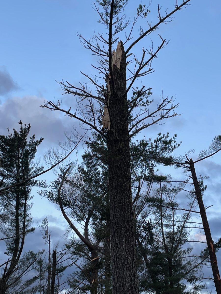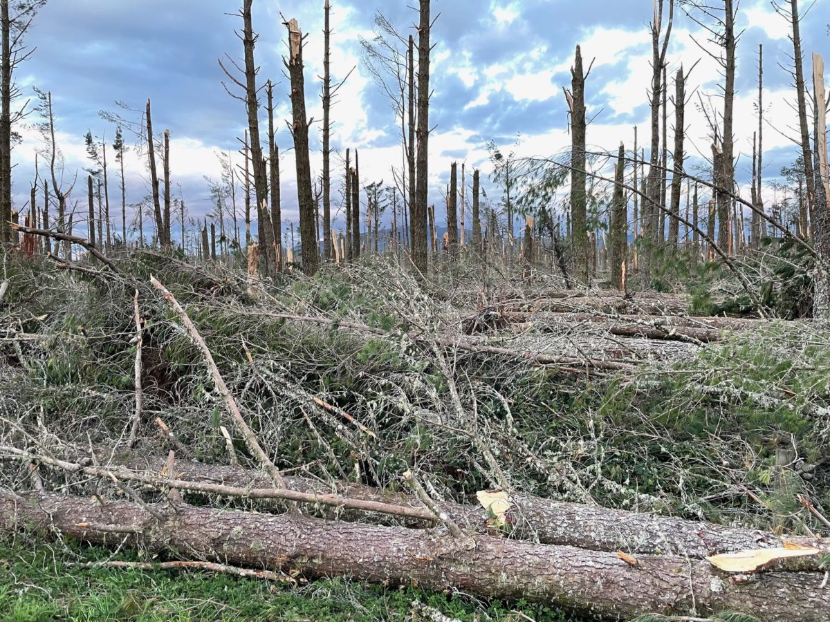 A pine tree, one of thousands snapped like matchsticks