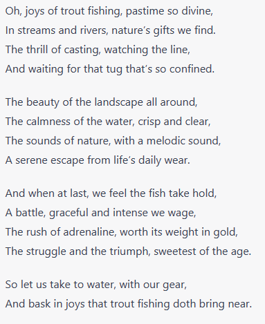 Sonnet on the joys of trout fishing that ChatGPT composed in about 3 seconds.