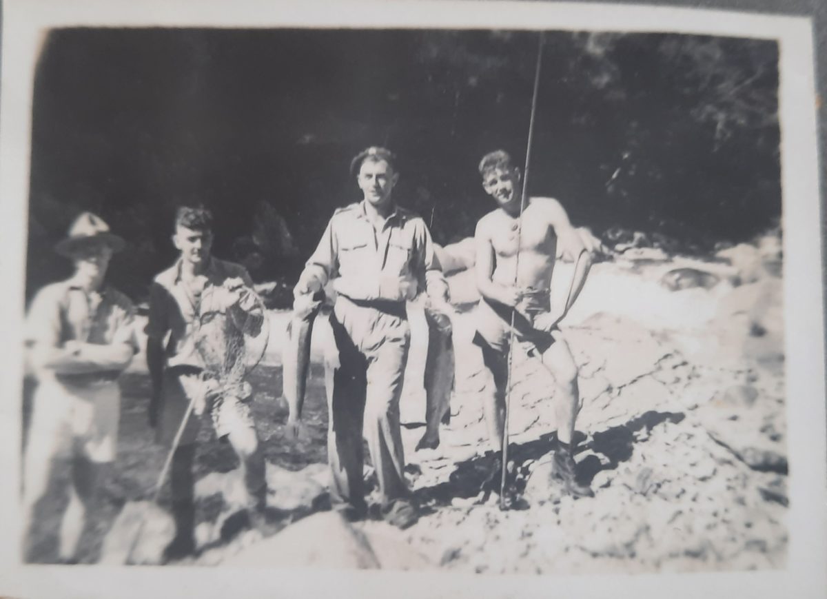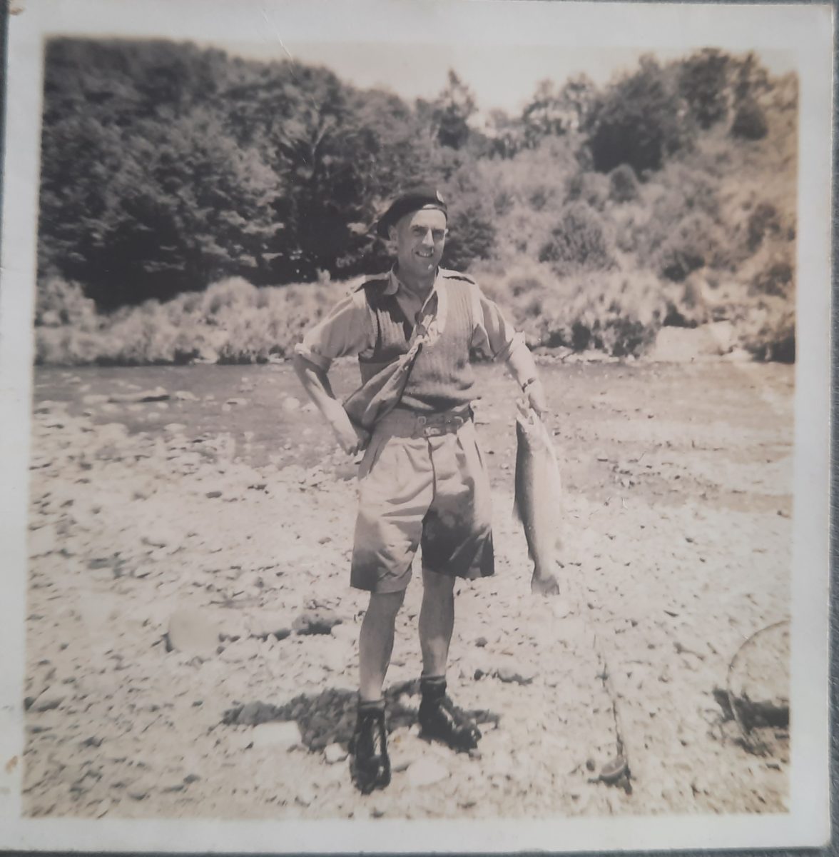 Jim Rutherford and crew fishing the Tongariro. In summer army uniform. No waders.